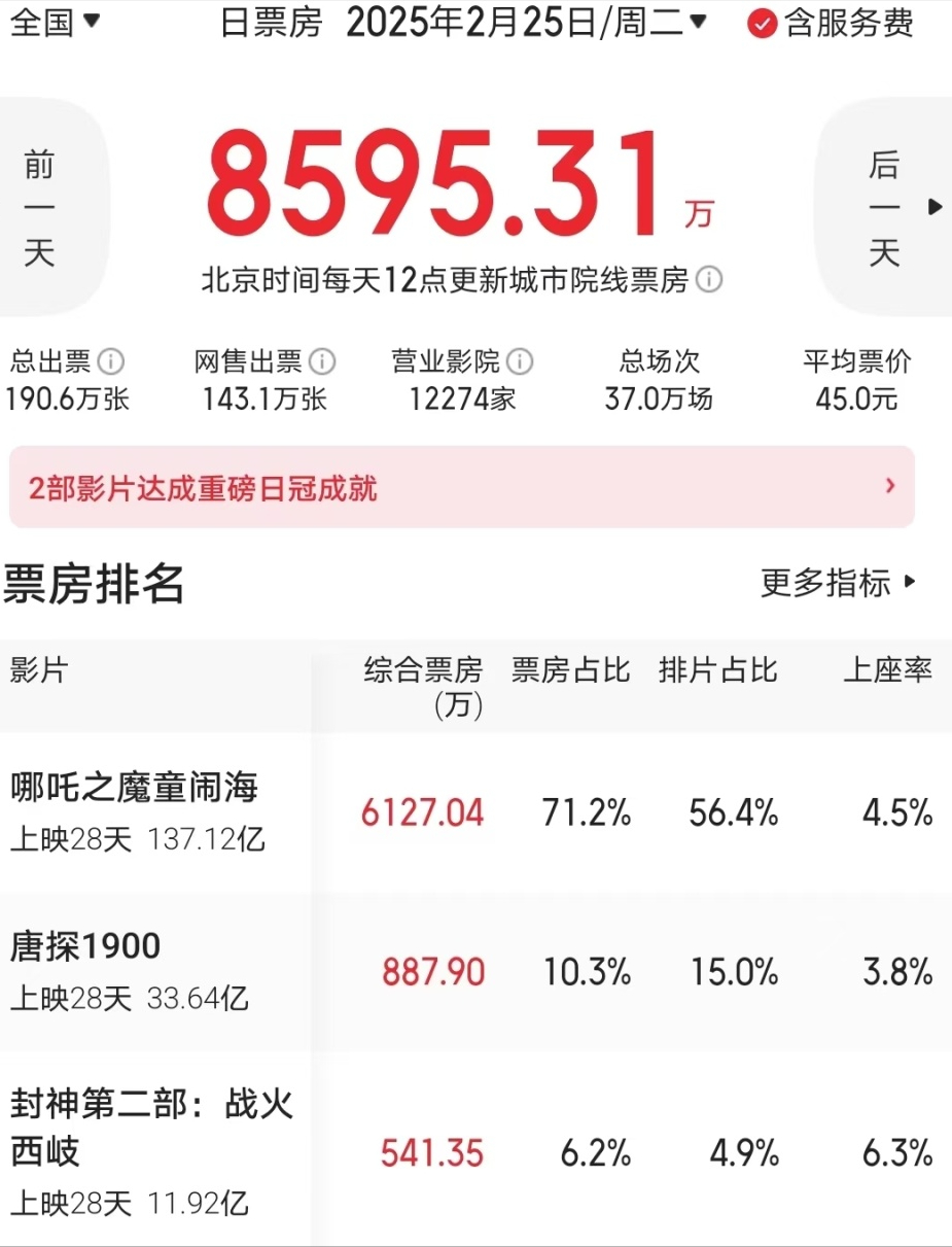 《哪吒2》的热度缓缓消退,它在岑岭期间的上座率一度逾越50%,而那时电影商场中的其他影片,以至有不少的上座率看守在5%以下。而如今,跟着技能的推移,影片的热度和不雅众的关怀度缓缓缓慢。到了2月25日,《哪吒2》的上座率仅为4.5%,而《封神2》却达到了6.3%。