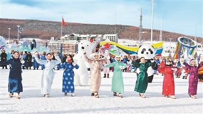 阿尔山花车巡游行为中,旅客与演员一谈轻歌曼舞,感受冰雪北疆。