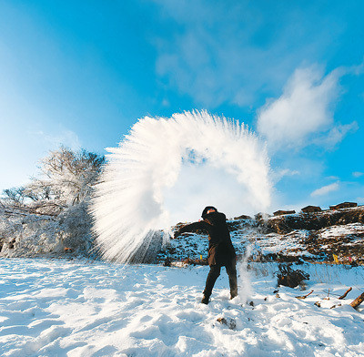 在阿尔山国度地质公园不冻河畔,旅客体验“泼水成冰”。