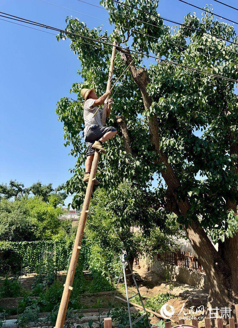 什川古戏班果农魏至玉正踩着蜈蚣梯修剪自家的百年梨树。东谈主民网记者 焦隆摄