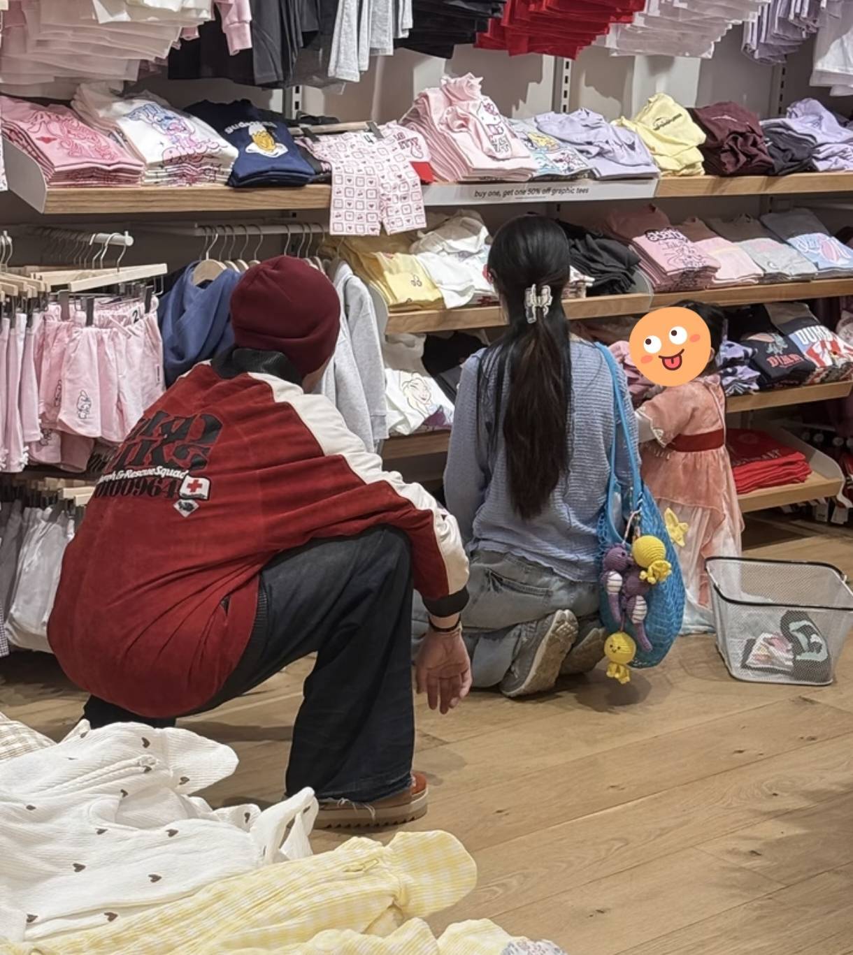 郭碧婷陪着男儿沿途挑选衣服,向佐就在背面蹲着等他们母女俩东谈主。