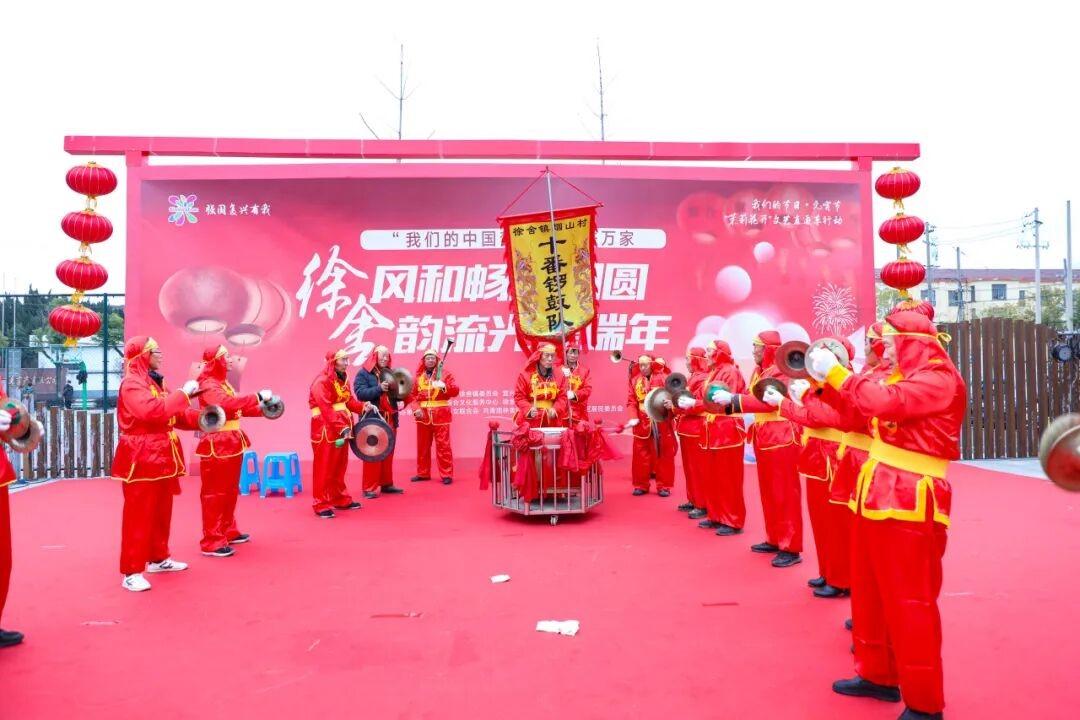 十番锣饱读队则呈现出另一番韵味,队员们手抓锣、饱读、钗等乐器,奏出古朴淳朴的音色,委宛明快的节拍点缀其间,敲响了传承数百年的乡土韵律。