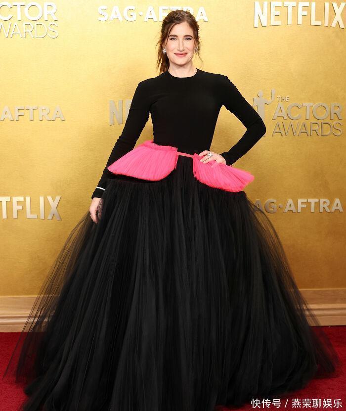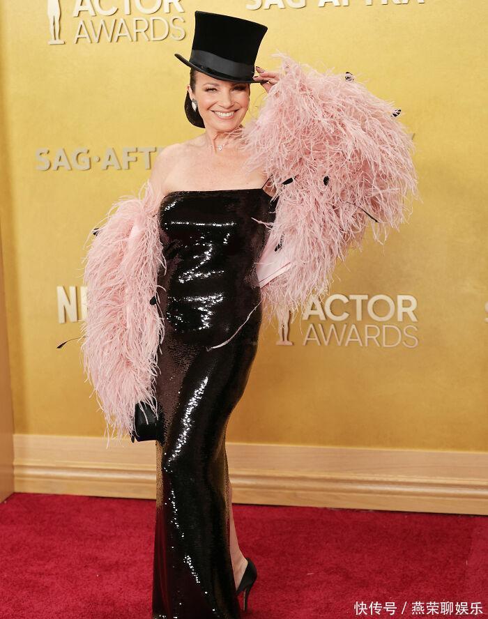 弗兰·德雷舍尔老是任重道远,这少许无须置疑。但偶然她也会用劲过猛,就像周日的受奖仪式上那样。这位出演过 《马蒂至尊》的女演员身着一套过于丽都的服装,包括一件玄色亮片长裙和一条粉色羽毛披肩,头上还戴着一顶引东说念主注算计打算玄色高顶弁冕。“今晚我要去插足Netflix的演员奖受奖仪式啦!《马蒂至尊》剧组得到了最好群戏提名!”她在受奖仪式前在Instagram上写说念,“祝我好运!”她还补充说念。#9、凯瑟琳·哈恩