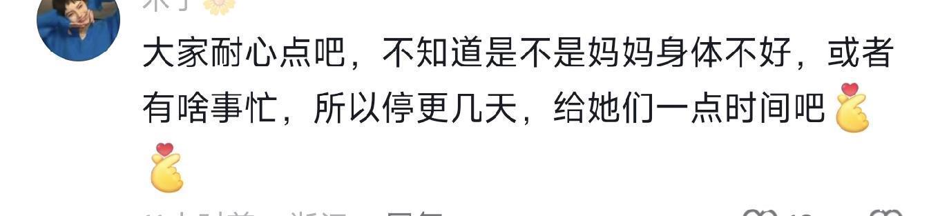 还有网友让环球稍安勿躁应该是许妈和大妹有很迫切的事是以才停更几天,否则昨天她们一定会出当今南农直播间,给她们小数时辰吧