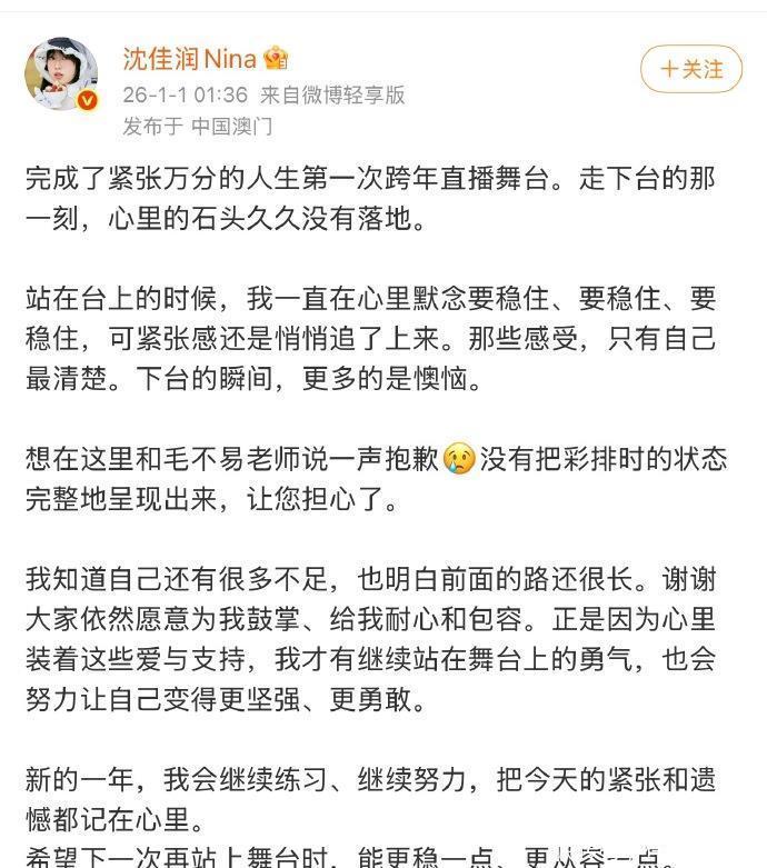 上演适度后三小时,沈佳润便在应付平台发布长文致歉,坦言“莫得把彩排时的状态完整呈现出来,让您缅念念了”,并开心会把这次的垂死与缺憾记在心里,新的一年加倍闇练。这份不规避乖僻、主动担责的气魄,得益了不少网友的好感。而毛不易的复兴更被赞“情商天花板”,他笃定了沈佳润的悉心与真诚,用“所有缺憾齐是为了更好的成为”为新东谈主减压,尽显前辈口头。沈佳润俏皮回复“不易哥哥(不知谈这么喊行不成哈哈哈)”,更让这场互动尽是暖意。