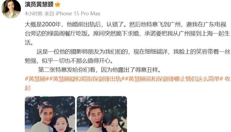 黄慧颐最近在酬酢平台发声,说两东谈主早在2001年就偷偷领了证。当时辰她还是是圈内小著名气的演员,而保剑锋还仅仅个新东谈主。为了不连累他发展,她选拔隐婚,服从换来的却是对方一再越界——不仅婚前就有“偏轨”行径,被发现后还下跪求原宥,她尽然心软答理了。 婚后她把要点转向家庭,可男方似乎没想象收心,致使拿她的大牌香水转送别东谈主。网友直呼:这哪是吃软饭,几乎是硬吃还砸锅。