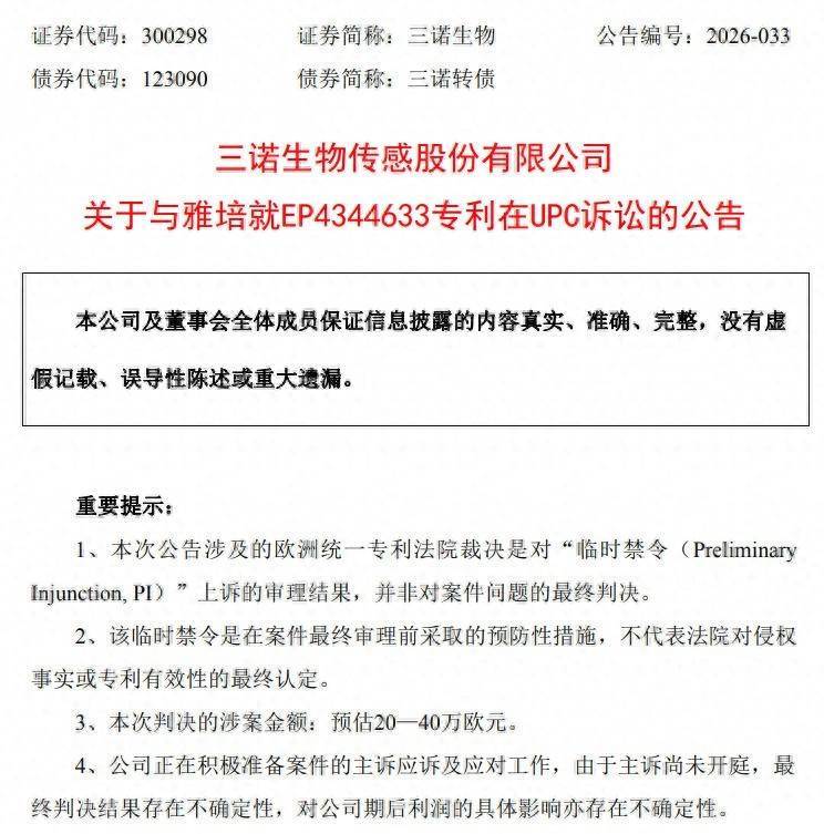 4月1日开yun体育网,三诺生物(300298)发布公告,公司收到欧洲合资专利法院(UPC)对于EP4344633专利上诉效果。