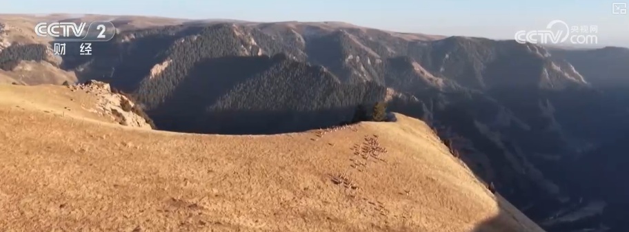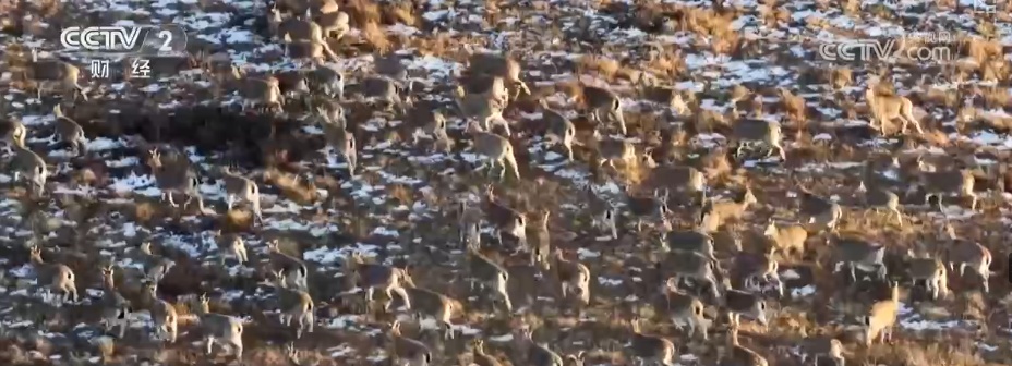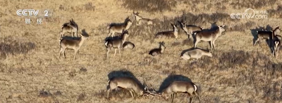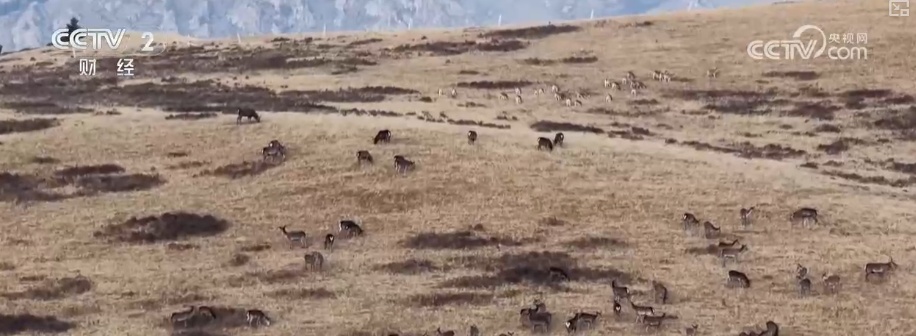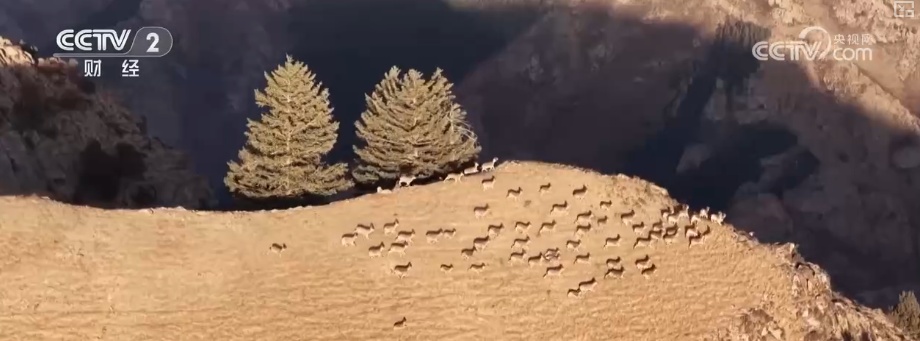 在画面里,数百只野生鹿群与岩羊群在草原上集群活动,与夕阳和祁连雪山一皆组成一幅象征的生态画卷。