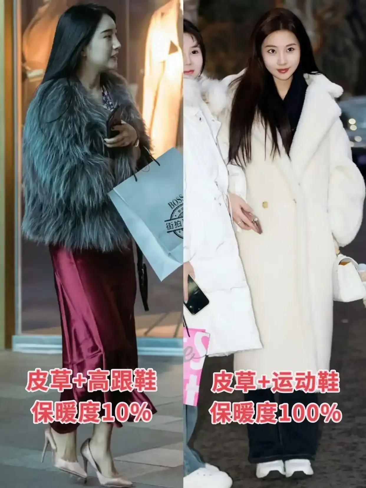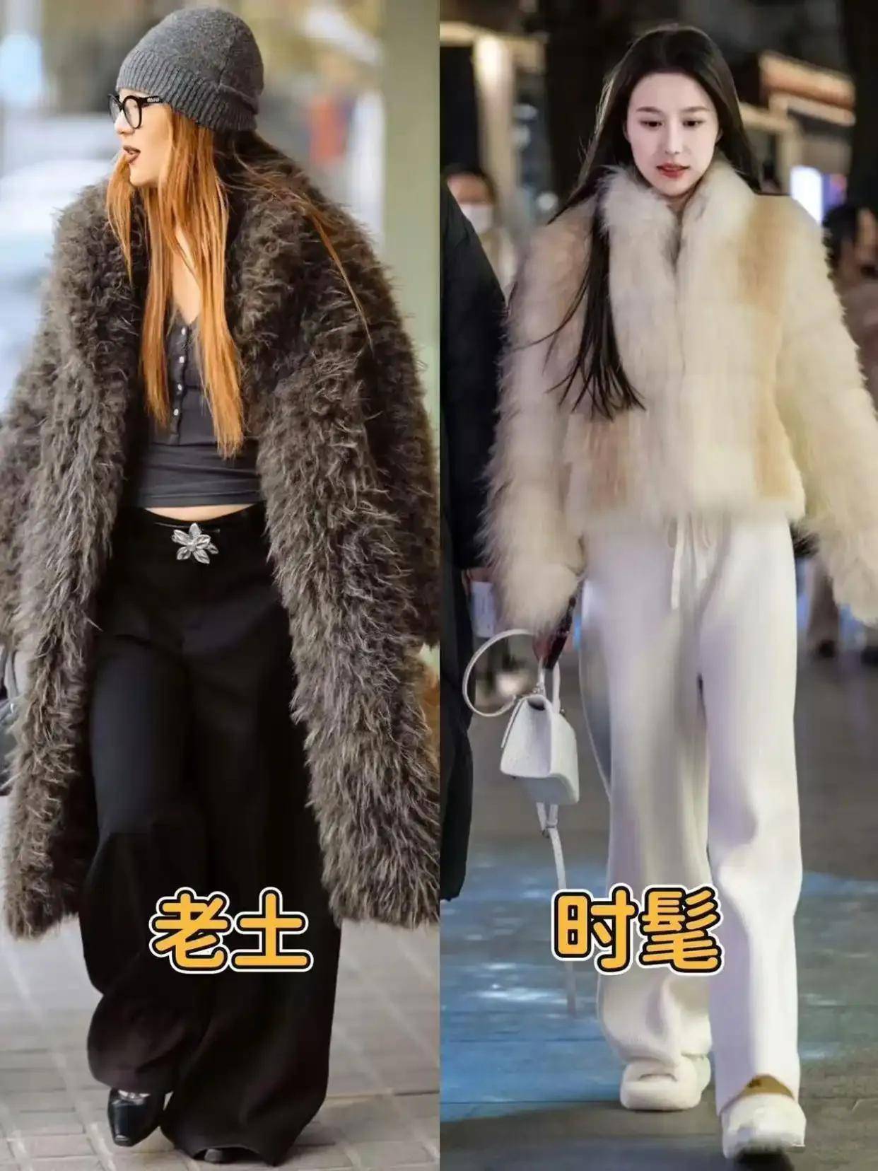皮草外衣要是你莫得选对名堂,通常也会显得肥美,举例上图中的左边这件灰色的皮草。版型太大,衣角如故外扩的缠绵,再加上这位街拍素东谈主不会搭配,聘请了紧身的衣服和阔腿裤来组合,有点老土。