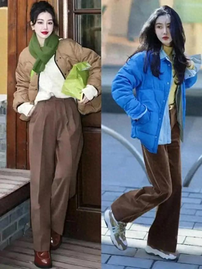 就像上头这位前卫达东谈主,用的等于一件棉服,搭配上驼色的直筒裤,脚上穿的棕色乐福鞋和老爹鞋,既御寒又前卫,从简干练,穿去上班、逛街、外出旅行、拍照都很出片。