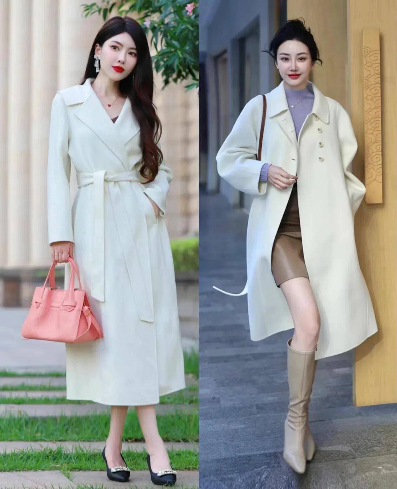 我个东谈主如故蛮保举你聘请白色大衣的,因为白色相比百搭,穿在身上就很领略干净。举例不错用翻领的大衣搭配上短裙,脚上穿的中筒靴,这么的造型更容易呈现出你落魄有致的身体。思要更多礼的情况下,用 X 版型的大衣外衣搭配上半身裙,脚穿一对玄色的低跟浅口单鞋就够。